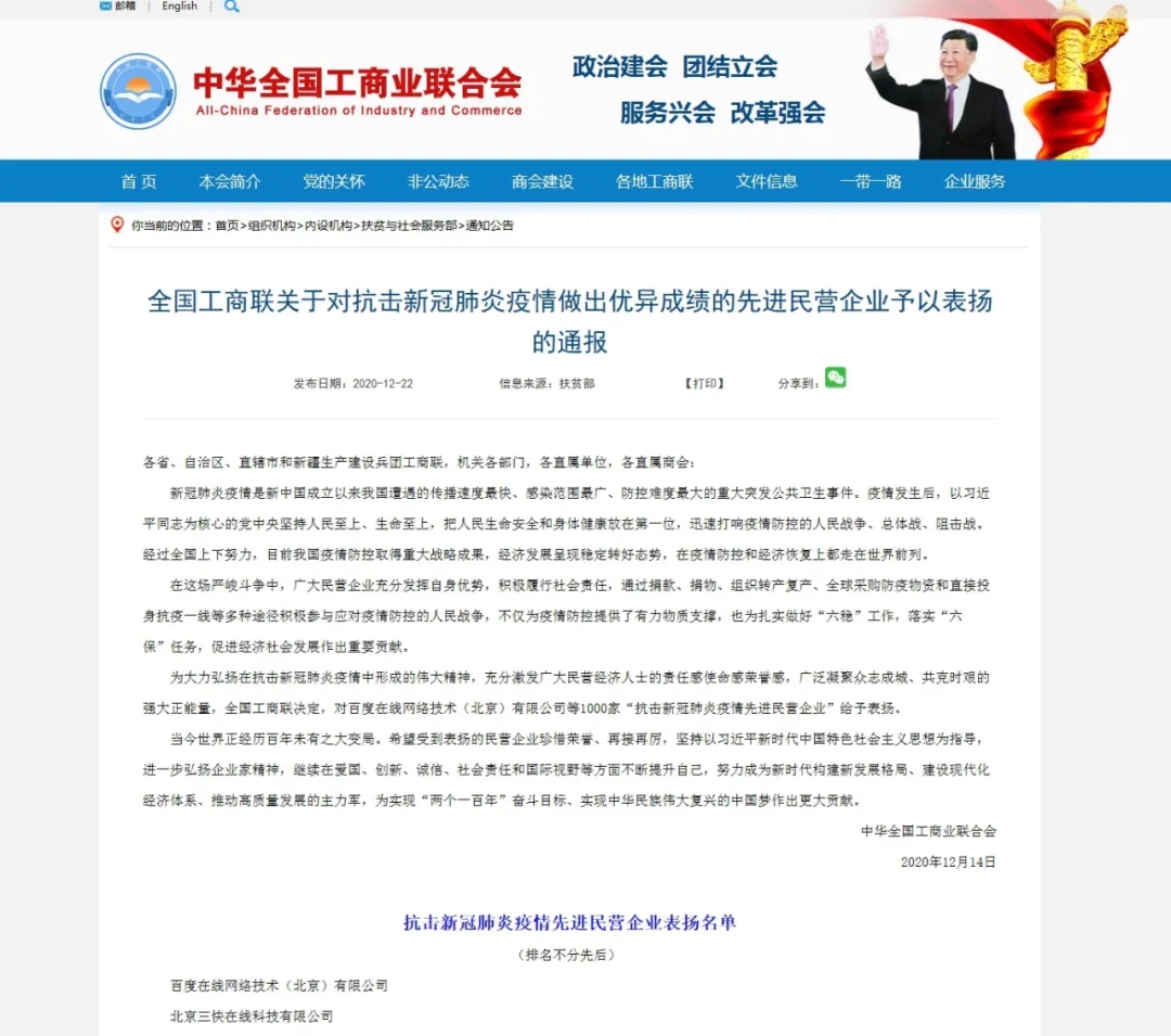 中华全国工商业联合会发布了《全国工商联关于对抗击新冠肺炎疫情做出优异成绩的先进民营企业予以表扬的通报》,为大力弘扬在抗击新冠肺炎疫情中形成的伟大精神,充分激发广大民营经济人士的责任感使命感荣誉感,广泛凝聚众志成城、共克时艰的强大正能量,对“抗击新冠肺炎疫情先进民营企业”给予表扬,江苏弗瑞仕环保科技有限公司获此殊荣。